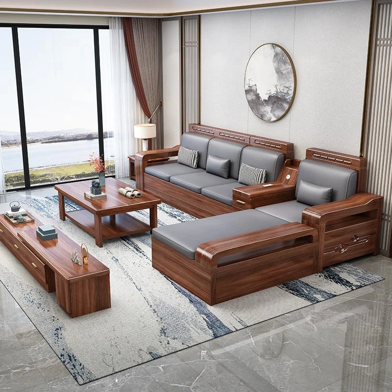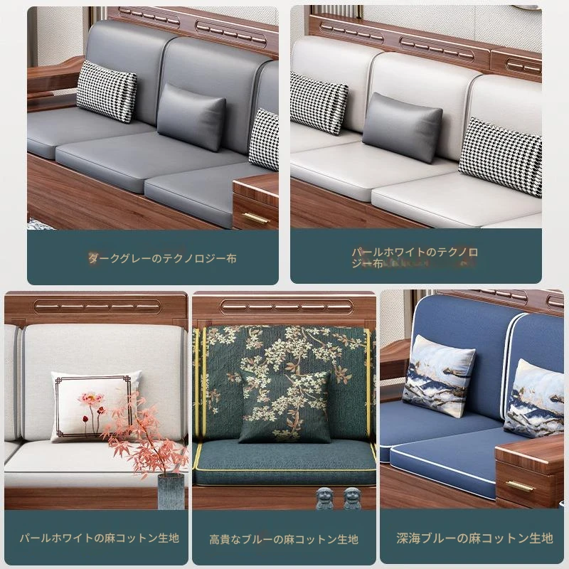 冬夏兼用!胡桃木全実木ソファセット – 中式現代デザインのリビングにぴったりの収納付きコーナー・カウチソファ!快適さとスタイルを兼ね備えた一品。