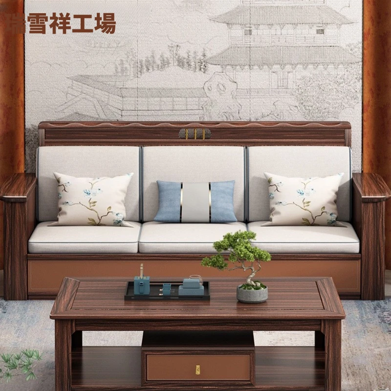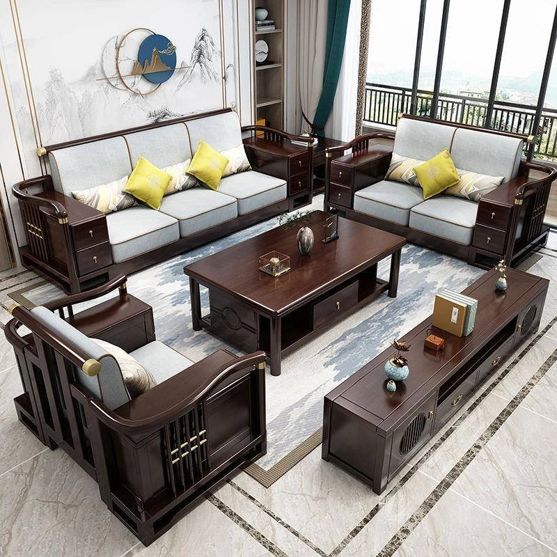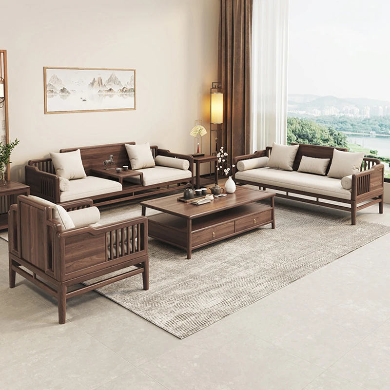 新中式スタイルの無垢材ソファセット - ヴィラのリビングや現代的なオフィスにぴったり!高級ブラックウォールナットを使用したシンプルで洗練されたデザインのソファで、居心地の良い空間を演出します。