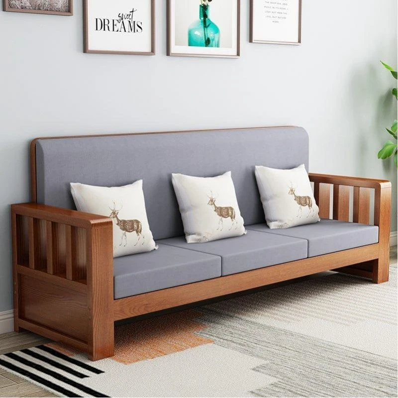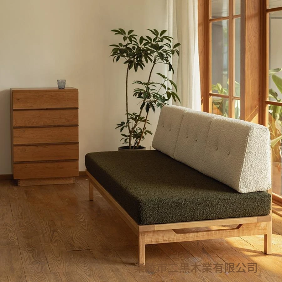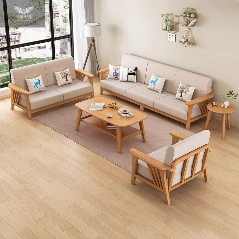 北欧スタイルの無垢材ソファセット - シンプルでモダンなデザイン、小さなリビングにぴったりの布張りウッドソファ。自然な原木色で、居心地の良い空間を演出します。