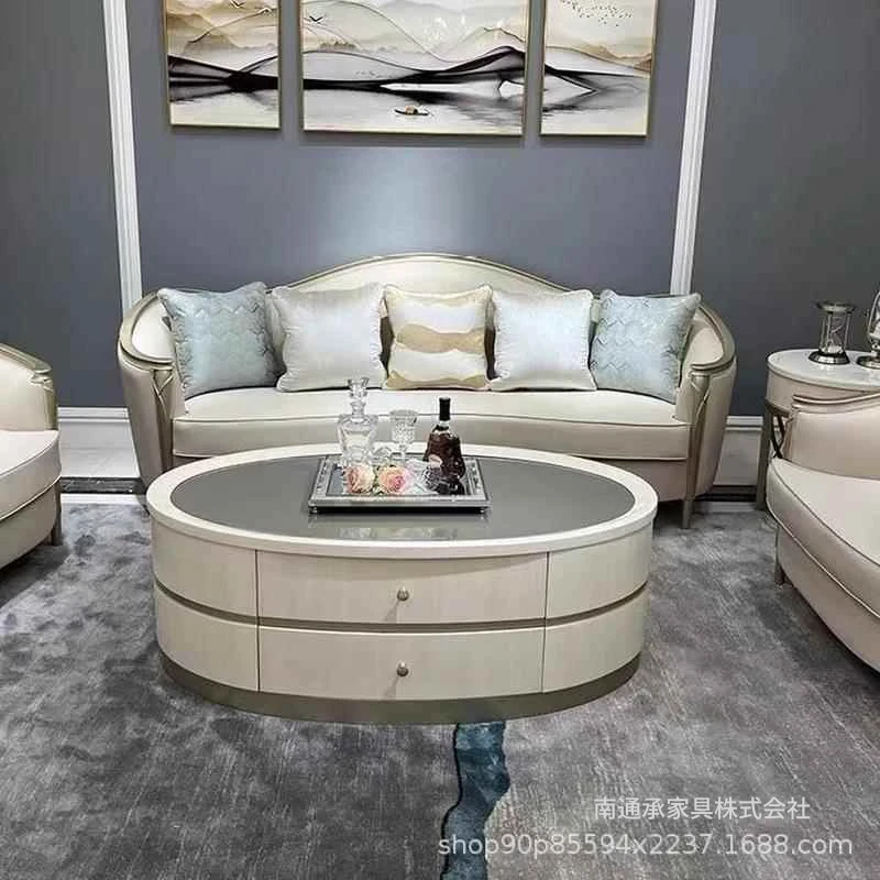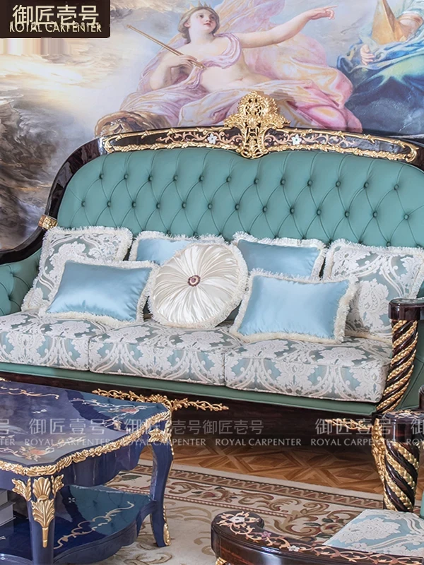 フランス風の高級布製ソファー、実木彫刻と本革のコンビネーション、大型リビングに最適な家具セット。優雅なデザインで、居心地の良い空間を演出します!